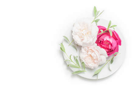 White plate is lying on a pink background, surrounded by a wreath of pink and white flowers, perfect for spring or easter