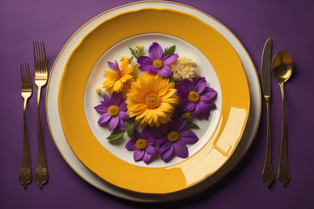 Beautiful table setting with bright flowers on violet background, top view. generative ai