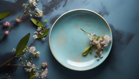 Empty blue plate with spring flowers on blue background. Flat lay, top view