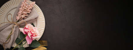 Festive table setting with beautiful roses, modern plates and cutlery on rustic grey background with copy space