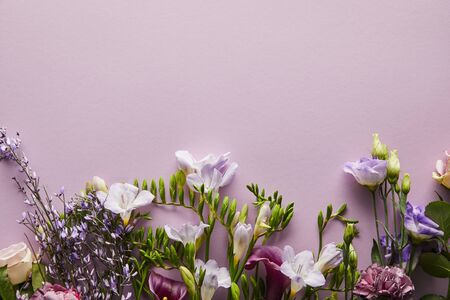 A bouquet of flowers in purple tones with a bud of eustoma and chrysanthemum. Close view