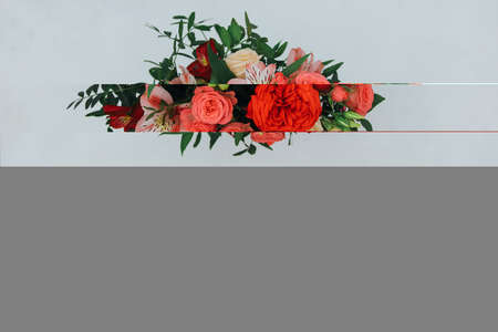 Red bouquet of rose, alstroemeria and eustoma in a green paper gift box on a gray background. close up top view