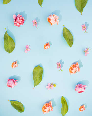 A beautiful pattern made of roses, flowers and leaves of pastel peach and purple and green colors on a light blue background. Flat lay minimal concept.