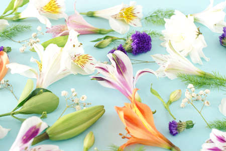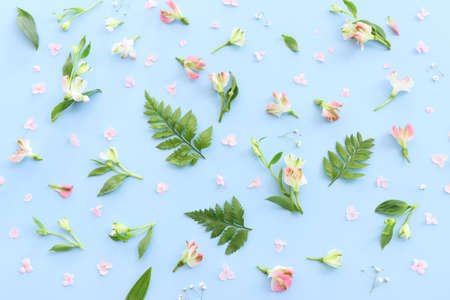 Floral pattern made of white and pink alstroemeria flowers on pastel blue background. Nature concept. Top view. Flat lay