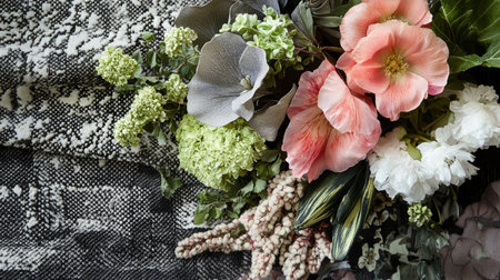 This beautiful image captures a top view of a vibrant flower bunch against textured fabrics, showcasing the rich colors and delicate petals for an artistic display.