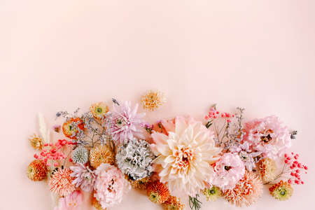 Flowers composition. Flat lay, top view floral background with flowers.