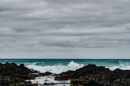 Surf on a rocky coast in front of the horizon under a cloudy sky. Tropical stormy ocean with waves crashing on the rocks. Stormy sea with stormy clouds and black lava rocks on the