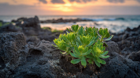 A vibrant green succulent grows on dark rocks by the water's edge as the sun sets, casting warm colors across the sky and reflecting on the ocean. The scene captures nature's beauty.