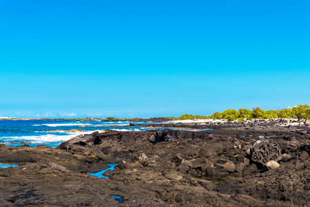 Santa Cruz Island offers stunning views with its clear turquoise waters and jagged volcanic rocks, a natural paradise in the Galapagos Archipelago, Ecuador