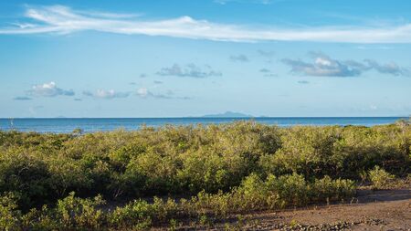 Dense mangrove on the waters edge by the beach, with the ocean in the background under a cloudy blue sky