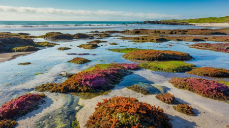 A scenic landscape view of a rocky coastline with tide pools. The pools are filled with colorful algae in pink, orange, and green hues. The sky is blue with scattered clouds. The ocean stretches to the horizon.