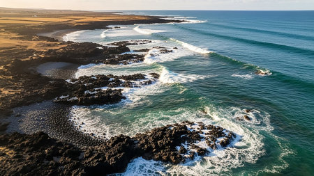 Turquoise showing dramatic aerial view of a rugged volcanic coastline with dark black rocks, turquoise ocean waves crashing, and a distant sandy beach keywords:...