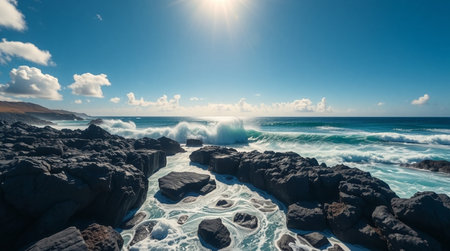 Feel the raw power of nature with waves crashing on rugged rocks. Experience the thrilling beauty of oceanic fury!