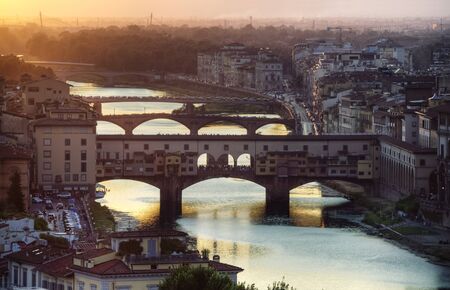 Florence or Firenze sunset Ponte Vecchio bridge. Panorama view from Michelangelo park square. Tuscany, Italy