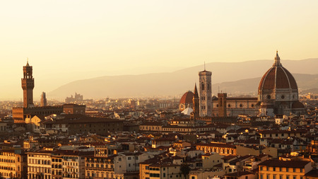 Amazing sunset panorama of Florence with Palazzo Vecchio palace and Cathedral of Saint Mary of the Flower (Santa Maria del Fiore), Florence, Italy
