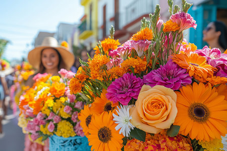 intricate floral designs displayed during Feria de las Flores, vivid colors of roses, lilies, and daisies, with blurred festivalgoers in the background