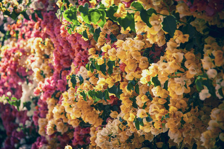 A variety of artificial fake flowers background, many bright colors, blooming, beautifully decorated, sold in one of the stores in the Thai rural market.