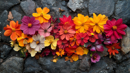 Brightly colored flowers are scattered over dark stones, presenting a striking contrast of hues. The arrangement highlights the beauty of nature in a harmonious blend of colors.