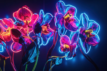 Glowing Neon Orchids: Vibrant and Futuristic Floral Display in Darkness