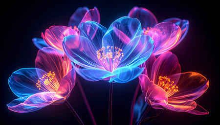 Neon orchid flowers glowing in vibrant pink and purple light with lush petals emitting modern futuristic shine. Beautiful contemporary botanical background, for interior decor or creative projects.