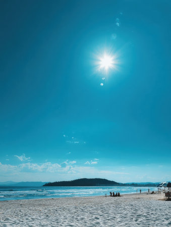 Sun shines brightly over the beach, illuminating golden sand and inviting waves while people enjoy the serene atmosphere and ocean views.