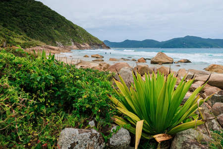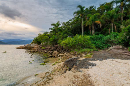 Beach with rocks and palms on a cloudy day in Florianopolis, Brazil