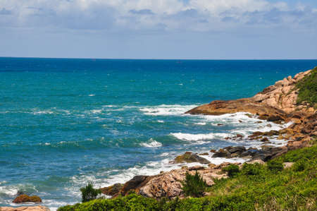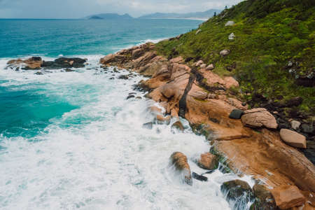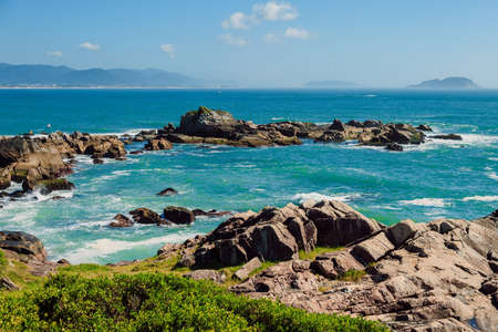 Rocky coastline and ocean with waves in Brazil. Ponta das Campanhas