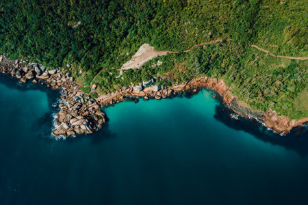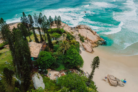 Coastline with beach, rocks and ocean in Brazil. Aerial view of Praia da Galheta