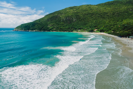Beach and ocean with surfing waves. Aerial view of Campeche beach in Floripa