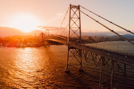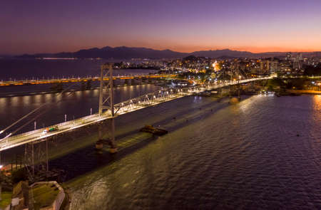 Hercilio luz cable bridge with sunset light in Florianopolis city, Brazil. Aerial view