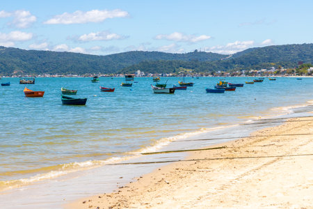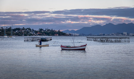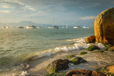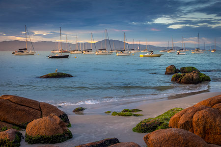 Boats in Florianopolis beach at sunset, Southern Brazil