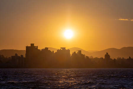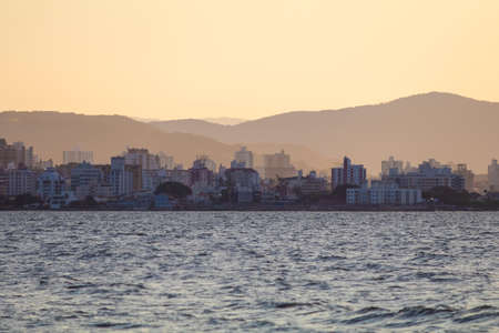 Row of buildings on the coast of Florianópolis at sunset, Santa Catarina, Brazil.