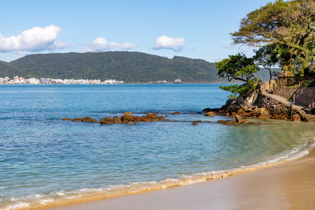 Costal town in Florianopolis, Brazil. Coastline with mountains and buildings