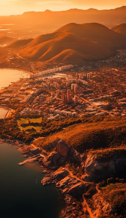 Generative AI : Aerial view of Follonica a small town along the Mediterranean Sea in Grosseto province at sunset Tuscany Italy