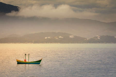 Bay with fishermen boat in Jurere beach at sunset Florianopolis, Brazil