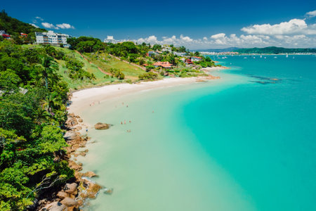 Beach with rocks and transparent blue ocean in Brazil. Aerial view of tropical beach in Florianopolis