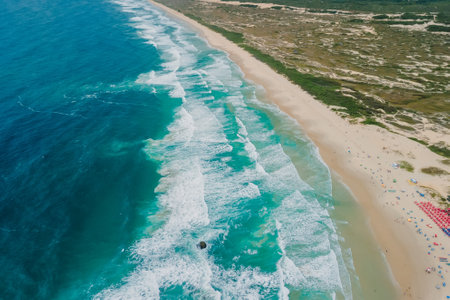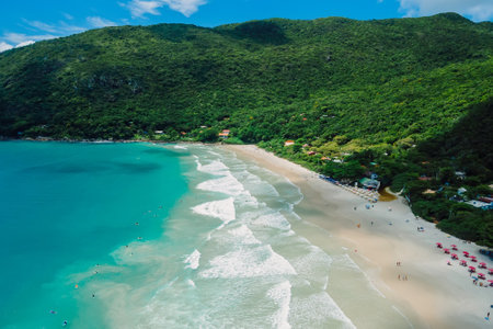 Scenic Matadeiro beach with ocean and waves in Santa Catarina. Aerial view