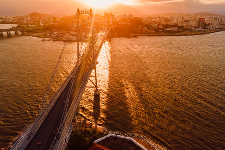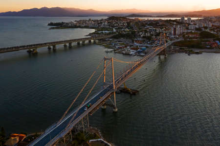 Old cable bridge with sunset light in Florianopolis, Brazil. Aerial view