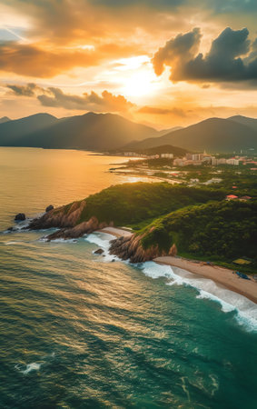 Generative AI : Aerial view of the coastline near the green mountains in a cloudy day Ocoa Azua Dominican Republic