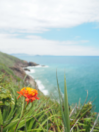 A view from a cliff seeing a small island surrounded by sea on a clear sky background