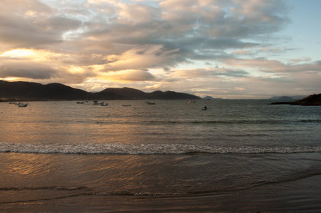 Bay with fishermen boat in Jurere beach at sunset Florianopolis, Brazil