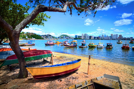 moored fishing boats, at the bottom of the sea with more boats, Florianopolis, Brazil.