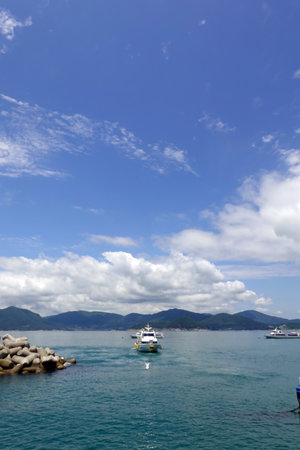 Many fishing boats on the water in the sea with beautiful clear blue sky