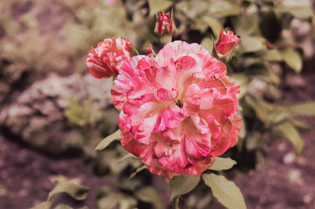 Beautiful pink and white rose in the garden. Vintage tone.