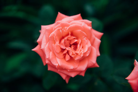 Beautiful orange and pink rose blossom, on a dark green background. Rose flower bud with pink petals top view on dark green background.