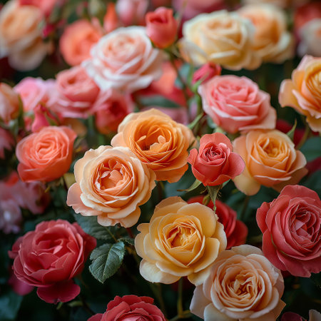 A stunning close-up view of vibrant roses in shades of pink, orange, and yellow, capturing the beauty of nature's blooms in a lush garden setting.