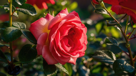 Beautiful red rose with green leaves in the garden on a sunny day