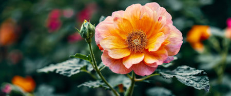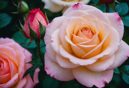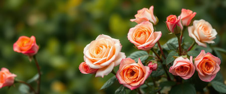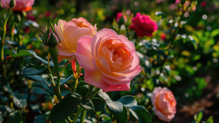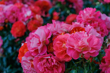 Beautiful pink and orange roses in a garden. Floral background