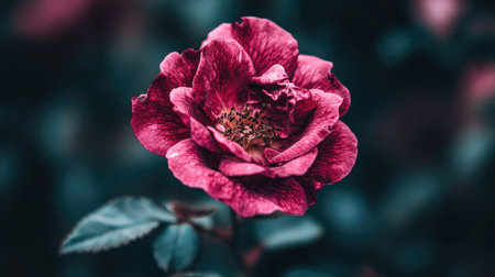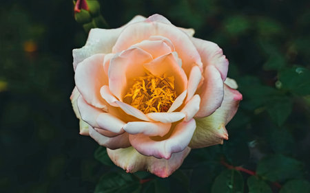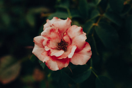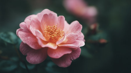 Beauty gently pink flower in wild nature. A beautiful red single rose bud is blossoming in a spring, summer garden. Dark key floral wallpaper. Floriculture, horticulture, growing flowers Romantic mood