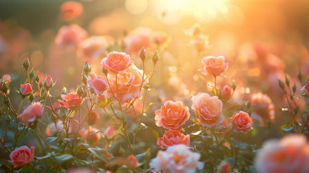 A stunning rose garden illuminated by the soft light of sunset, featuring vibrant orange and pink flowers amidst lush greenery, creating a tranquil evening atmosphere.